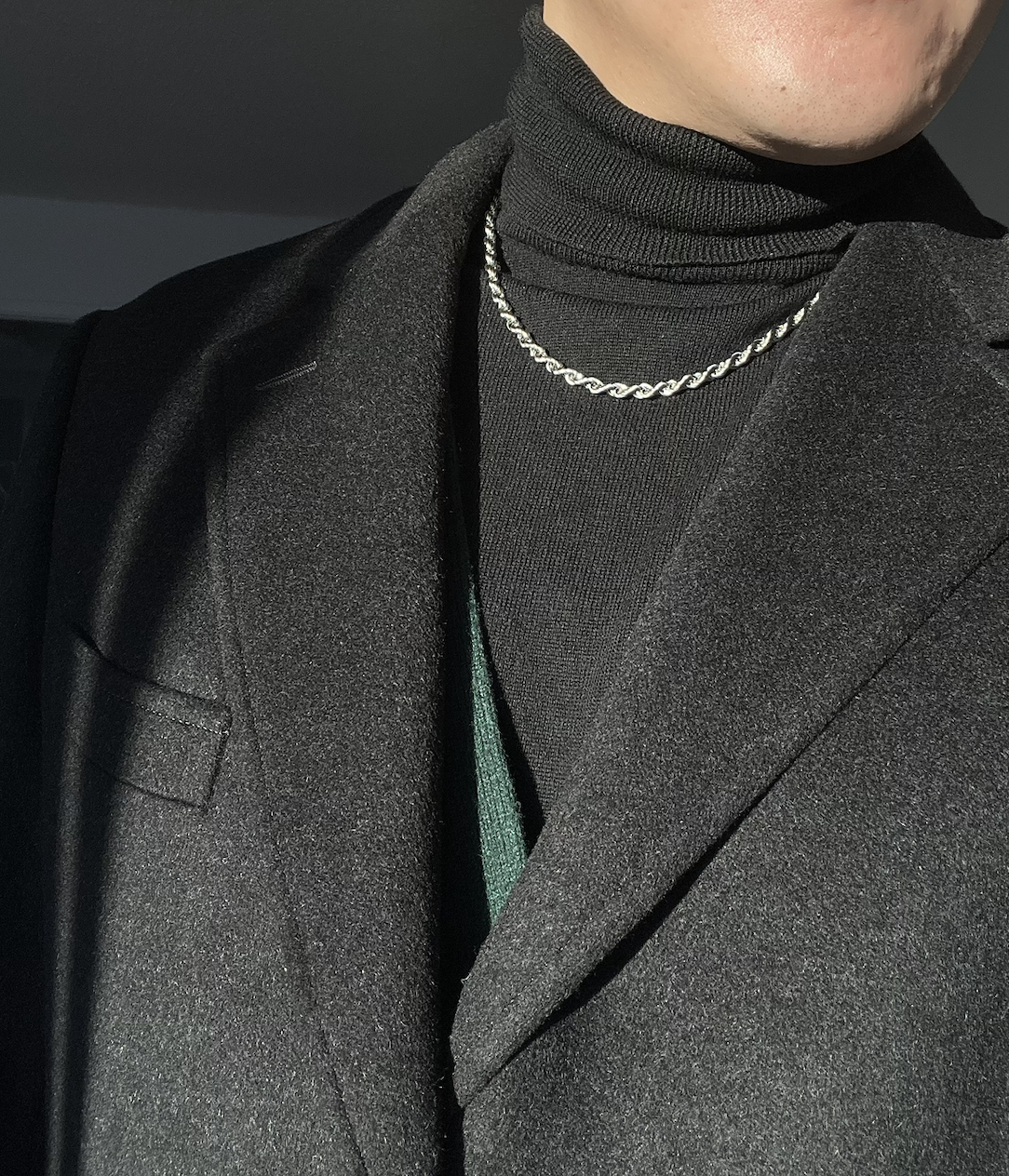 Wool cashmere overcoat, merino wool turtle neck, wool cardigan green