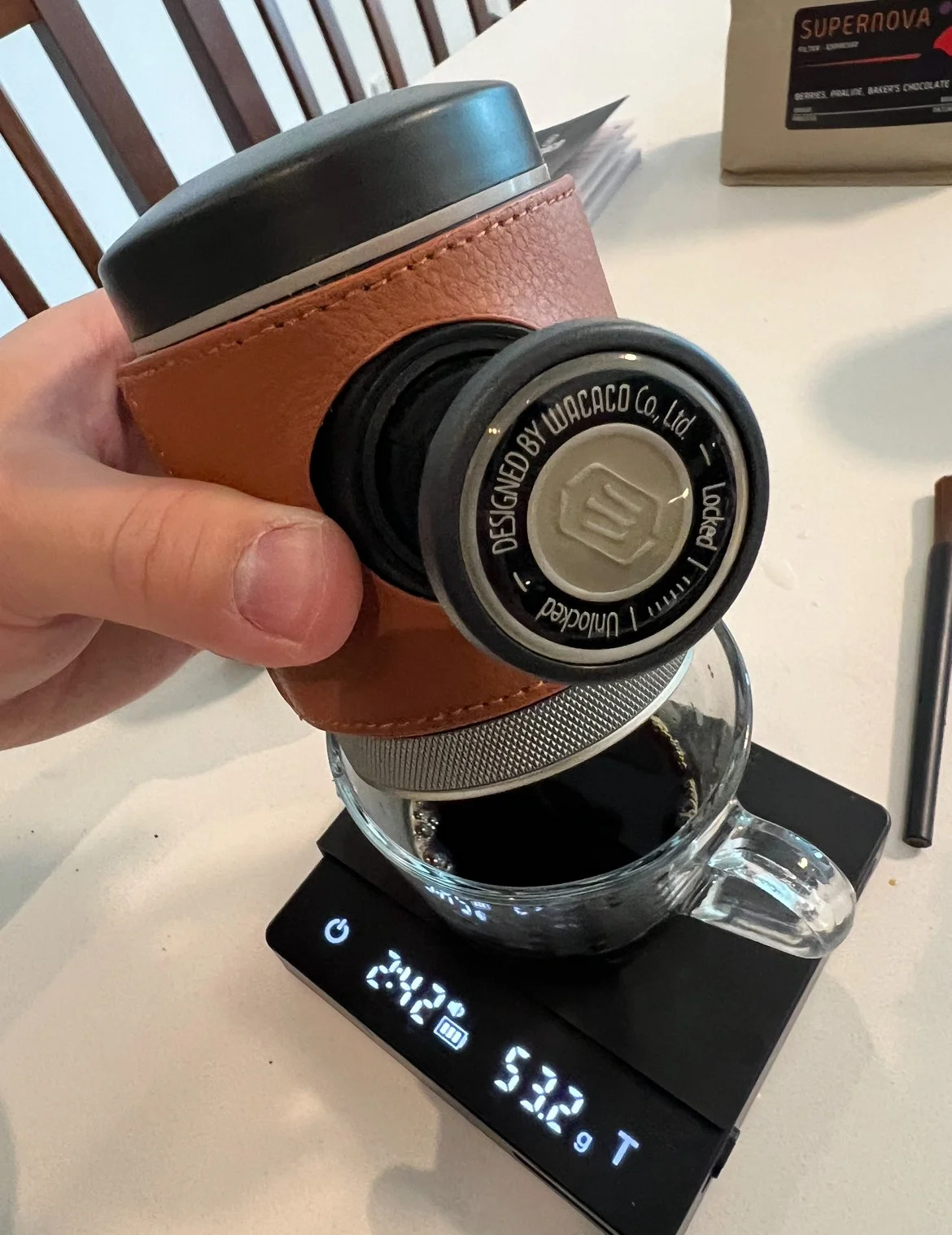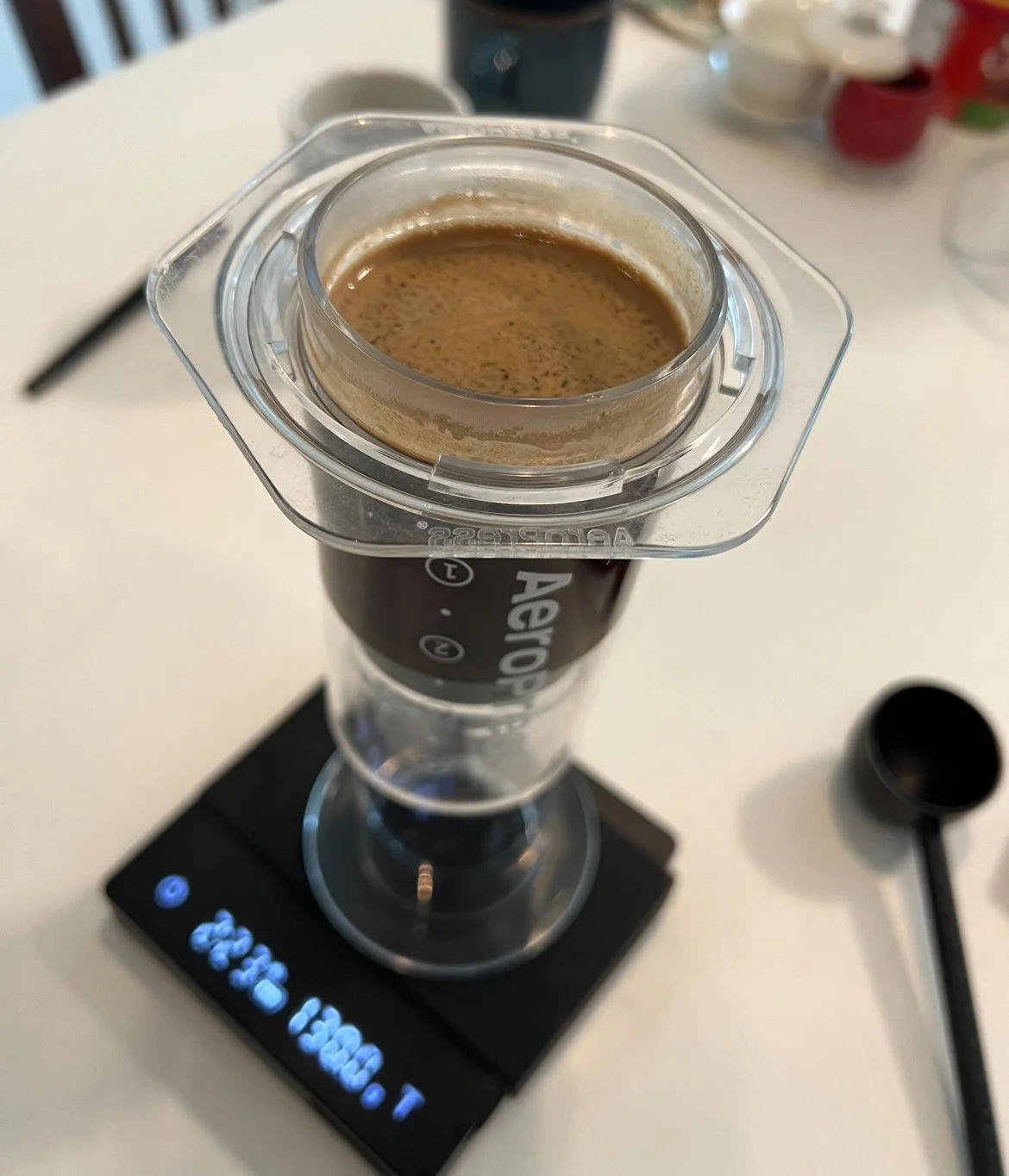 Aeropress iced coffee: 8.5g beans, 40 clicks, inverted insert 2.5 mark, 130g water, Ice in cup